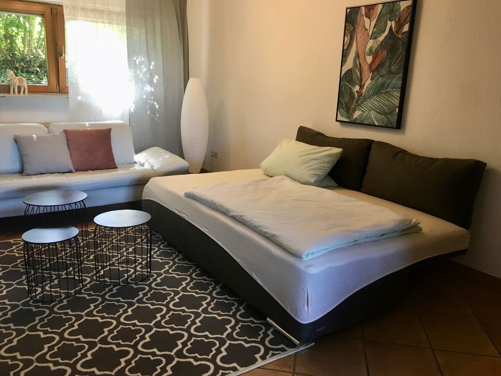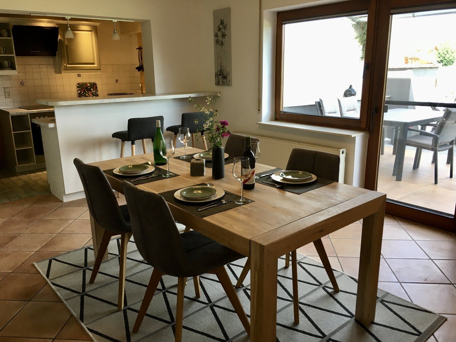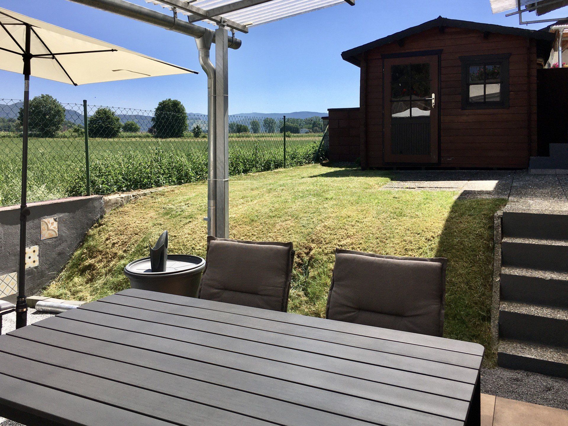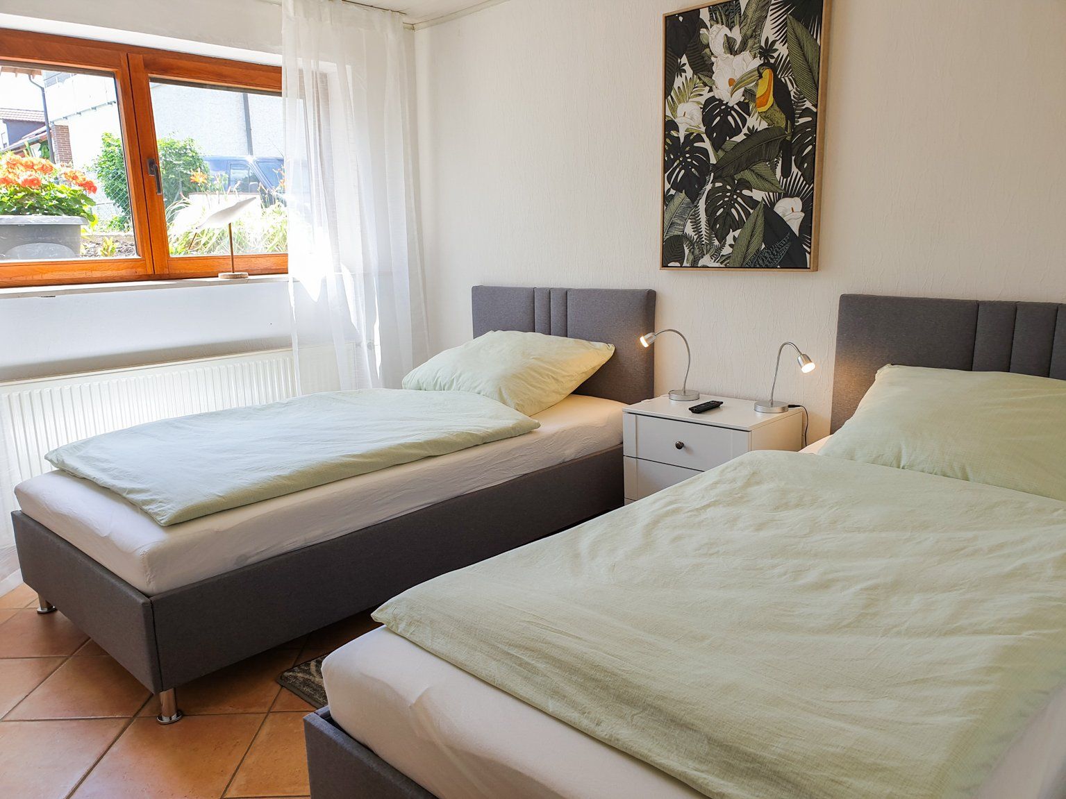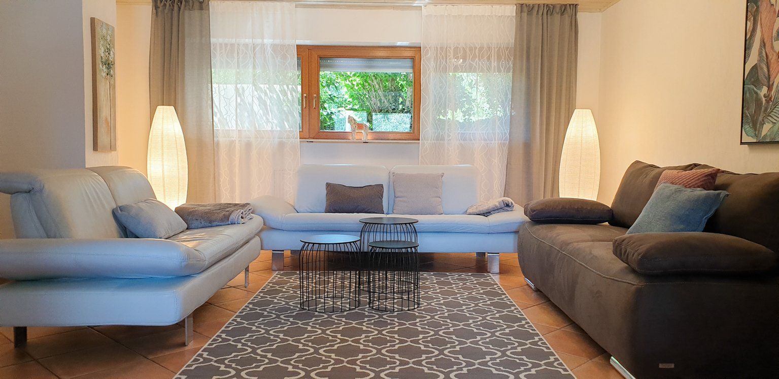 Es gibt zwei separate Schlafzimmer, ausgestattet mit jeweils einem 32"-TV. Eines der Schlafzimmer hat ein Doppelbett (1,80 m x 2,00 m) und das zweite Schlafzimmer verfügt über 2 Einzelbetten (je 1,00 m x 2,00 m). Im offenen Wohnbereich kann eines der drei Sofas als Schlafsofa (Boxspringfunktion) genutzt werden. Ausgeklappt hat es eine Liegefläche von ca.1,60 m x 2,00 m). Ein 46"-TV gehört außerdem zur Ausstattung. Das Bad hat eine Dusche, Badewanne und WC. Zusätzlich gibt es ein separates Gäste-WC. Die Küche ist voll ausgestattet u.a. mit einem Backofen, Geschirrspülmaschine, Mikrowelle, Toaster, Kaffeemaschine und Wasserkocher. Vom Essbereich haben Sie Zugang zur großen Terrasse/Garten mit Gartenmöbeln (Tisch mit Stühlen, Bank, Gartenliege). Sie befindet sich am Feldrand und dadurch haben Sie einen unverbauten Blick auf die schöne Bergstraße.